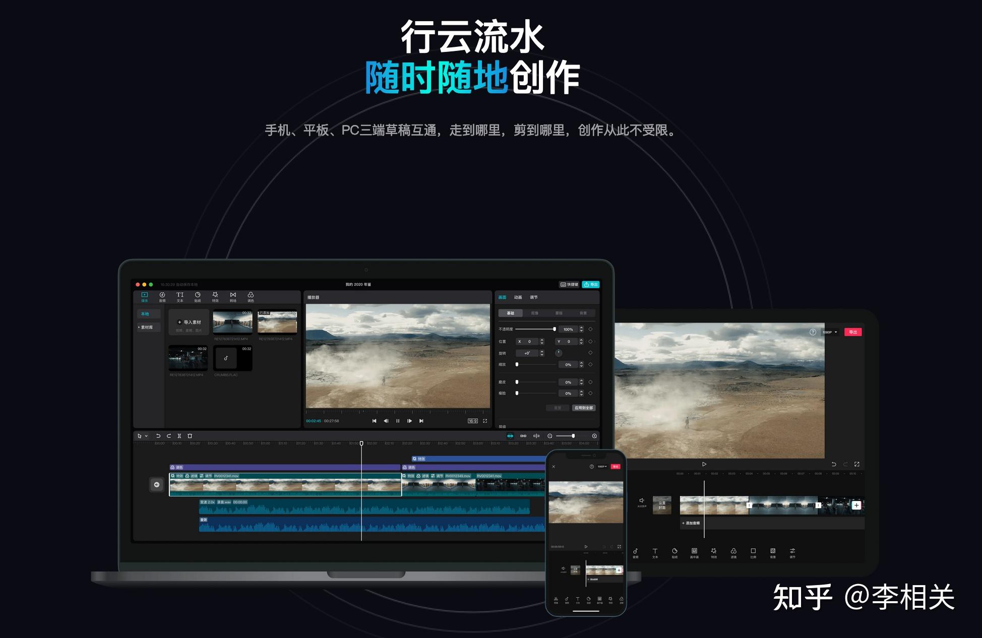 不仅有类似于电脑端的横屏界面,而且支持媒体、效果、叠加、文字和手写分层编辑,快速制作出你想要的视频效果!