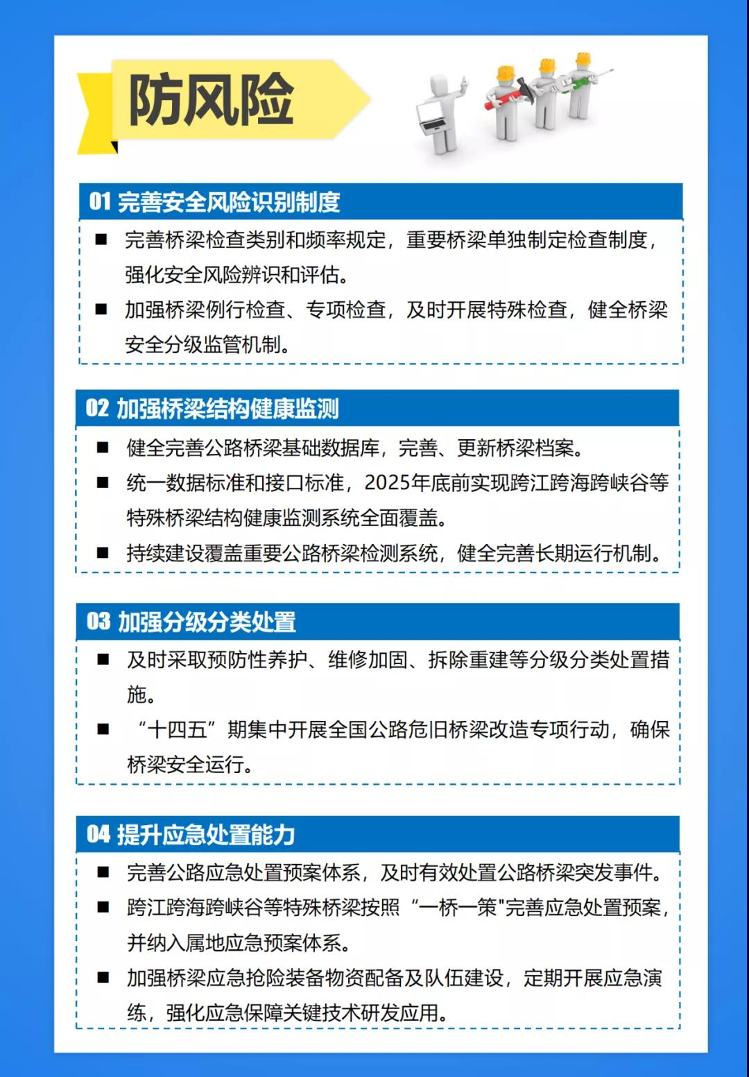 《意见》指出,在提高公路桥梁建设质量方面,要提高规划勘察设计质量,坚持桥梁全生命周期勘察设计理念,加强工程建造质量安全,保障合理工期,严控建材质量,优化施工工艺,完善标准化建造体系,实行质量终身负责制。在提升公路桥梁管养水平方面,要推动建立健全“政府主导、行业监管、部门协同、运行单位负责”的公路桥梁管养责任体系,分类落实管养资金,提高养护资金标准,提升预防性养护水平,并强化养护工程管理,推进养护市场化改革,提升养护工程实施效果和质量。在完善公路桥梁安全风险防控体系方面,要完善安全风险识别制度,加强桥梁结构健康监测,加强分级分类处置,提升应急处置能力,切实化解重大安全风险,确保桥梁安全运行。在强化公路桥梁安全保护方面,要完善公路桥梁法规标准,严格车辆超限超载治理,加强公路桥梁区域保护执法。在提升创新发展能力方面,要创新发展桥梁工程技术,加快智能公路桥梁发展,完善创新发展体系,加强桥梁领域国际合作。